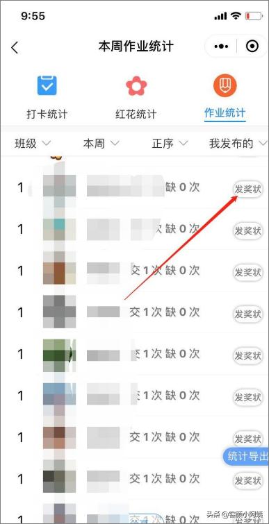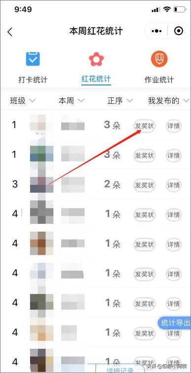 3、进入“班级统计”,里面有“红花统计、作业统计”根据自己实际需求选择进入,找到“发奖状”。