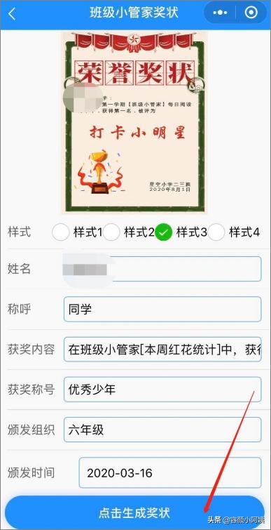 4、点击进入“发奖状”,有四种“样式”可选择,可以根据自己班上的实际情况自定义“奖项内容、奖项称号”,最后点击生成奖状。