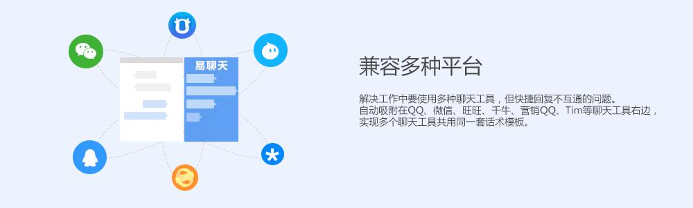 解决工作中要使用多种聊天工具,但快捷回复不互通的问题。易聊天自动吸附在QQ、微信、旺旺、千牛、营销QQ、Tim、拼多多商家工作台等聊天工具的右边,实现多个聊天工具共用同一套话术模板。