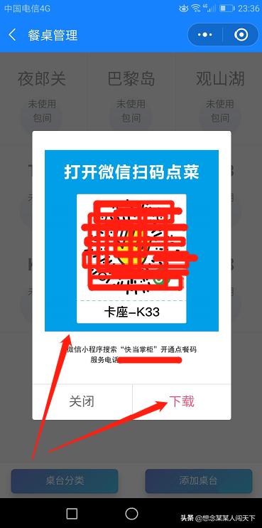 5.添加好桌台后,点击桌台弹出功能窗口,点击顶部的桌台码,即可生成小程序点餐二维码,将生成的点餐二维码下载打印出来贴在桌台上、用户即可正常使用。