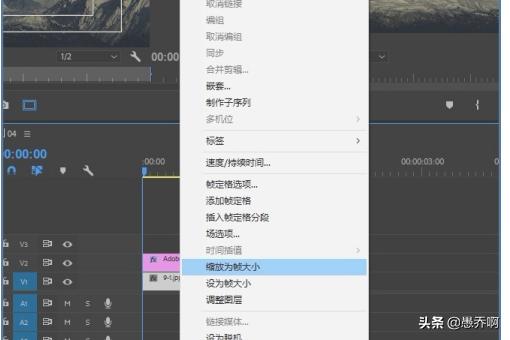 1素材放在视频轨,点击右上窗口的“选项”---点击“属性”就看到"变形素材",把“变形素材 ”前的方块打勾,这时在预览窗中会出现一个框,此时可根据你的需要按住黄色框边进行调整。