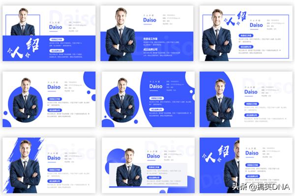 2.上面的版式,过于典雅,那如果你想更高端大气一些,不妨,把人放在整个PPT里,然后在画面的空白处加上文案。这个文案,可以是姓名,职位,加一段简介。