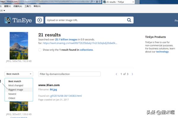 4网站马上为我们找出了这张图片的许多版本,但怎么知道哪一张是原图呢?是这样的,后来转发的人通常会对图片进行压缩、切割处理,因此绝大多数情况下最大的图片就是原图。我们点开左边的下拉菜单,选择Biggest image。