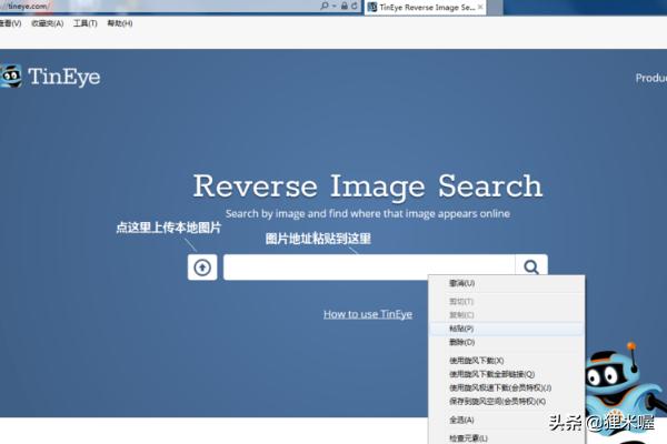 3在浏览器地址栏中输入Tineye的网址(见图),然后按下回车进入tineye网站。把刚才复制下来的图片地址粘贴到网页中间的搜索栏里,然后点击右边的搜索按钮。
