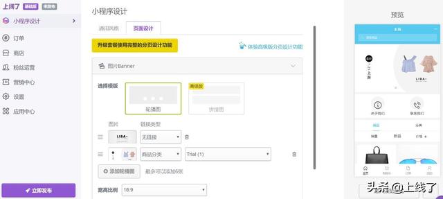 2.在“小程序设计”-通用风格栏你可以设置小程序整体风格、分页导航;点击“页面设计”你可以添加各种功能版块,包括轮播图、拼接图、视频、标题、快捷按钮、商品分类等等。
