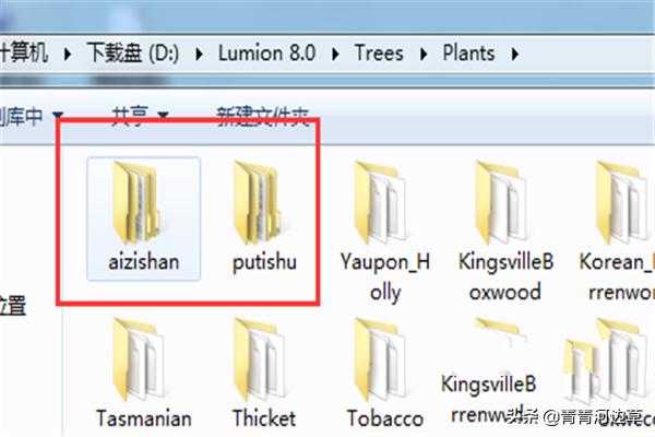 2本文以lumion8.0为例,把植物素材放到lumion安装文件夹下:如小编的lumion安装在D盘,则目录为:D:\Lumion 8.0\Trees\Plants (注意复制的时候,植物素材库文件夹名字必须是字母,避免报错),如图2,小编示范把putishu这一植物素材的文件放到该路径下。